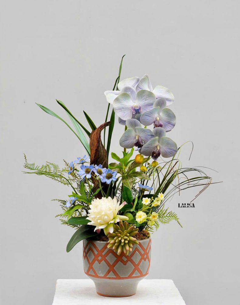 Những nhành lan hồ điệp trắng pha xanh tro lụa cao cấp được cắm nghệ thuật trên thân gỗ lũa tự nhiên, tạo dáng cao thanh thoát và sang trọng. Hoa được phối cùng bình gốm họa tiết hình học hiện đại, mang đến tổng thể tinh tế, khác biệt và đẳng cấp.