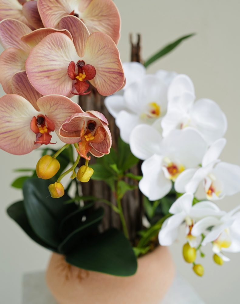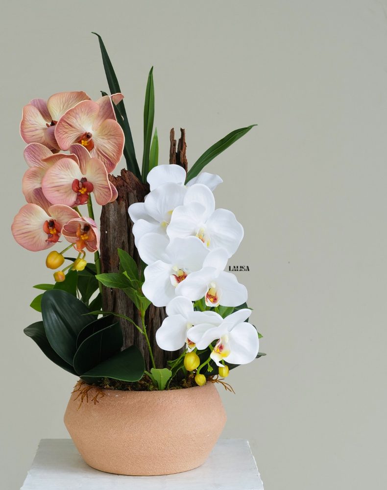 Mô tả: Mẫu chậu lan hồ điệp trắng cam được cắm nghệ thuật trên thân gỗ lũa tự nhiên, tạo dáng cao thanh thoát và hài hòa. Sự kết hợp giữa sắc lan trắng tinh khôilan cam nude ấm áp mang đến tổng thể cân bằng, sang trọng mà vẫn gần gũi.